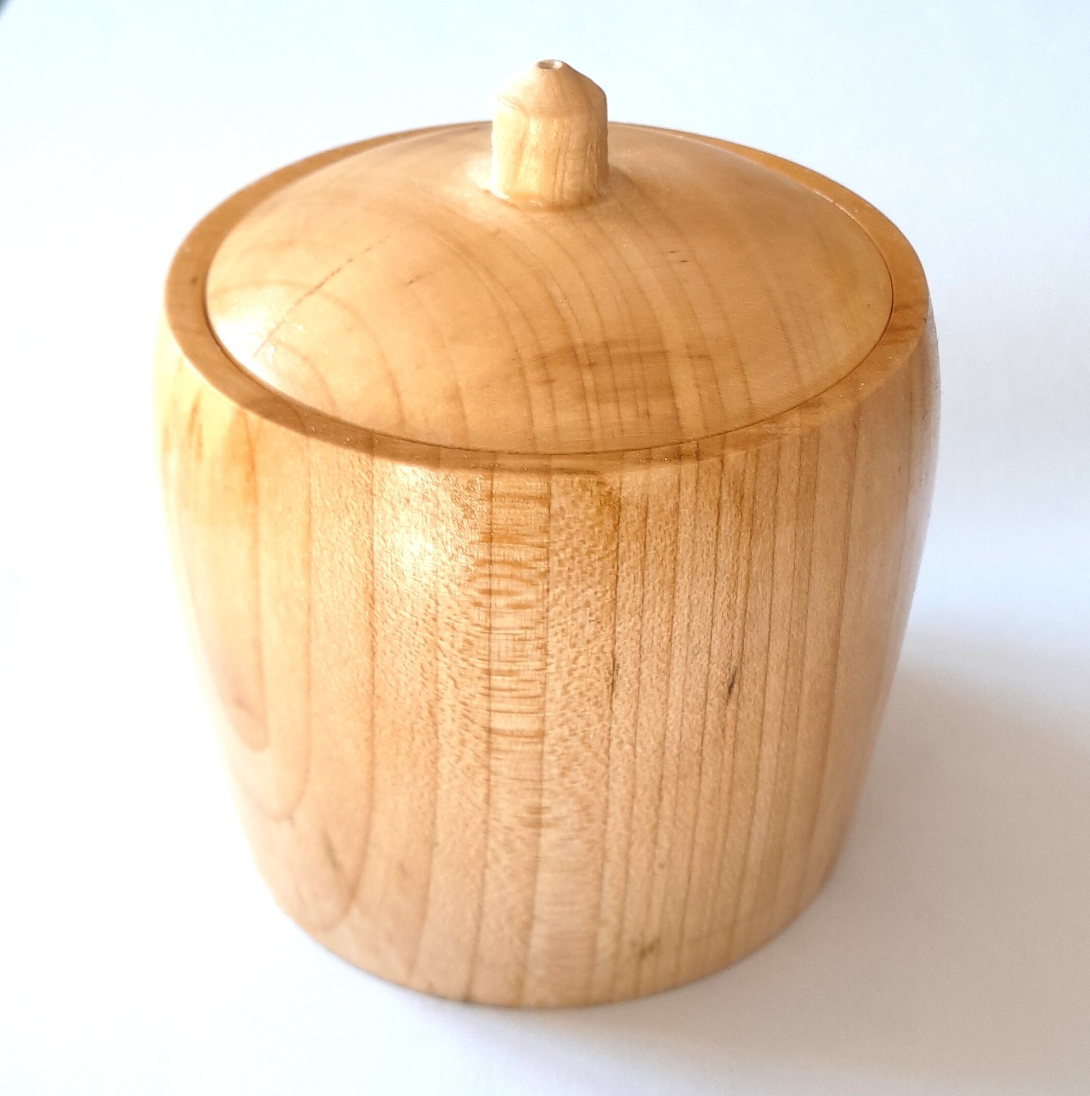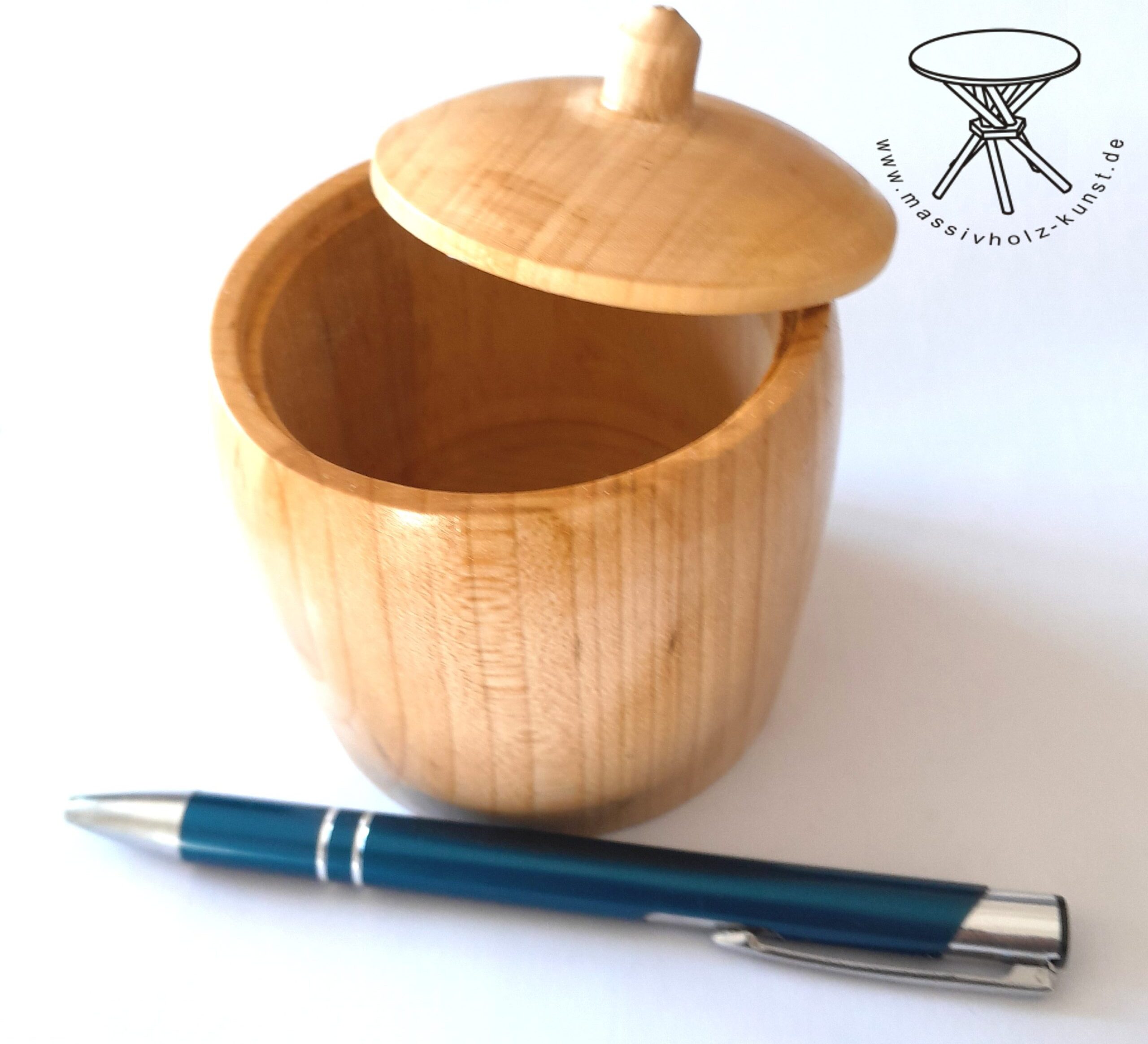Bewundern Sie die kunstvolle Schönheit dieser von Hand gedrechselten Holzdose aus Ahornholz mit einer wunderschönen Maserung. Die Form verleiht dieser Dose einen einzigartigen Charme und vielseitige Einsatzmöglichkeiten.