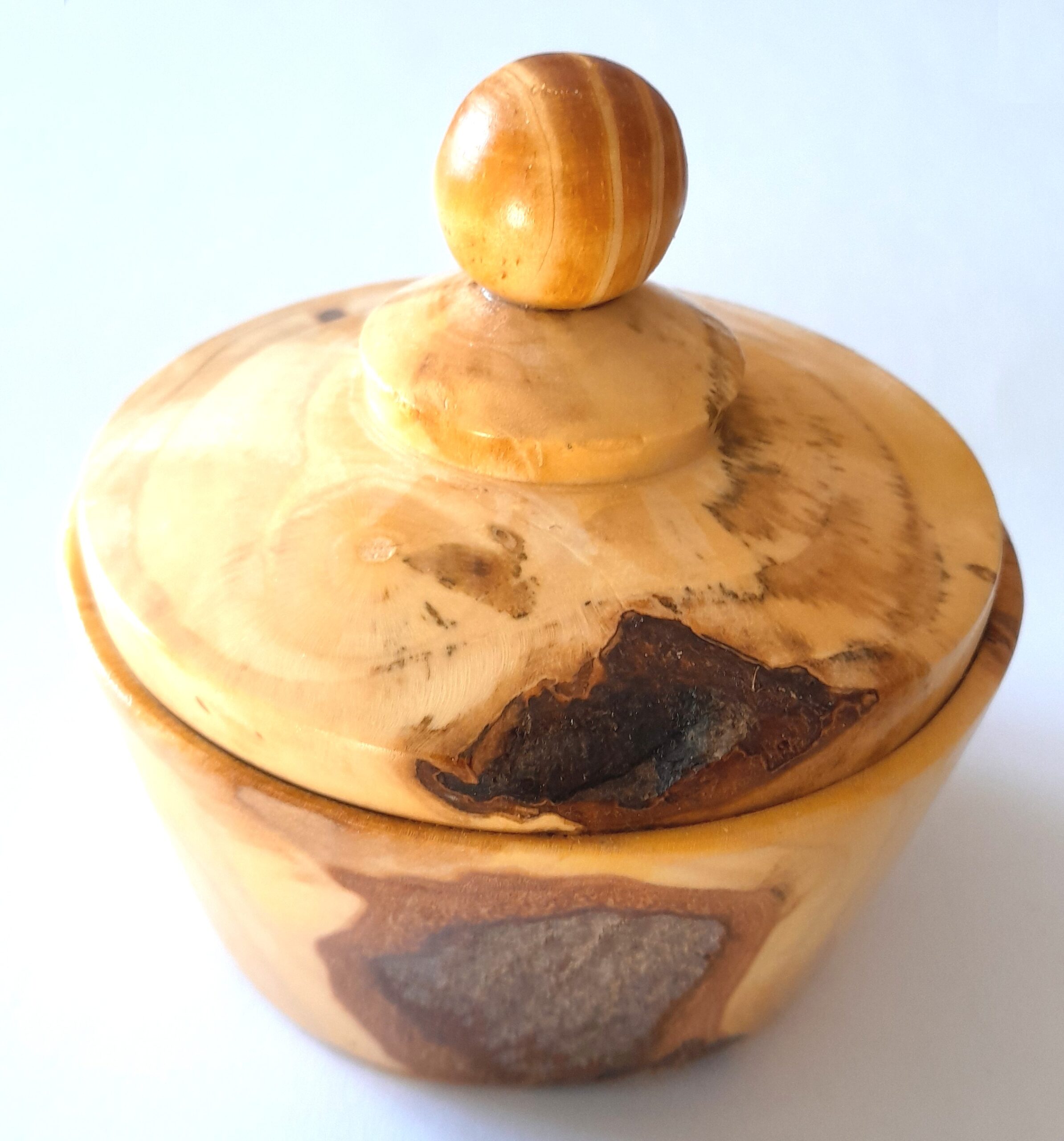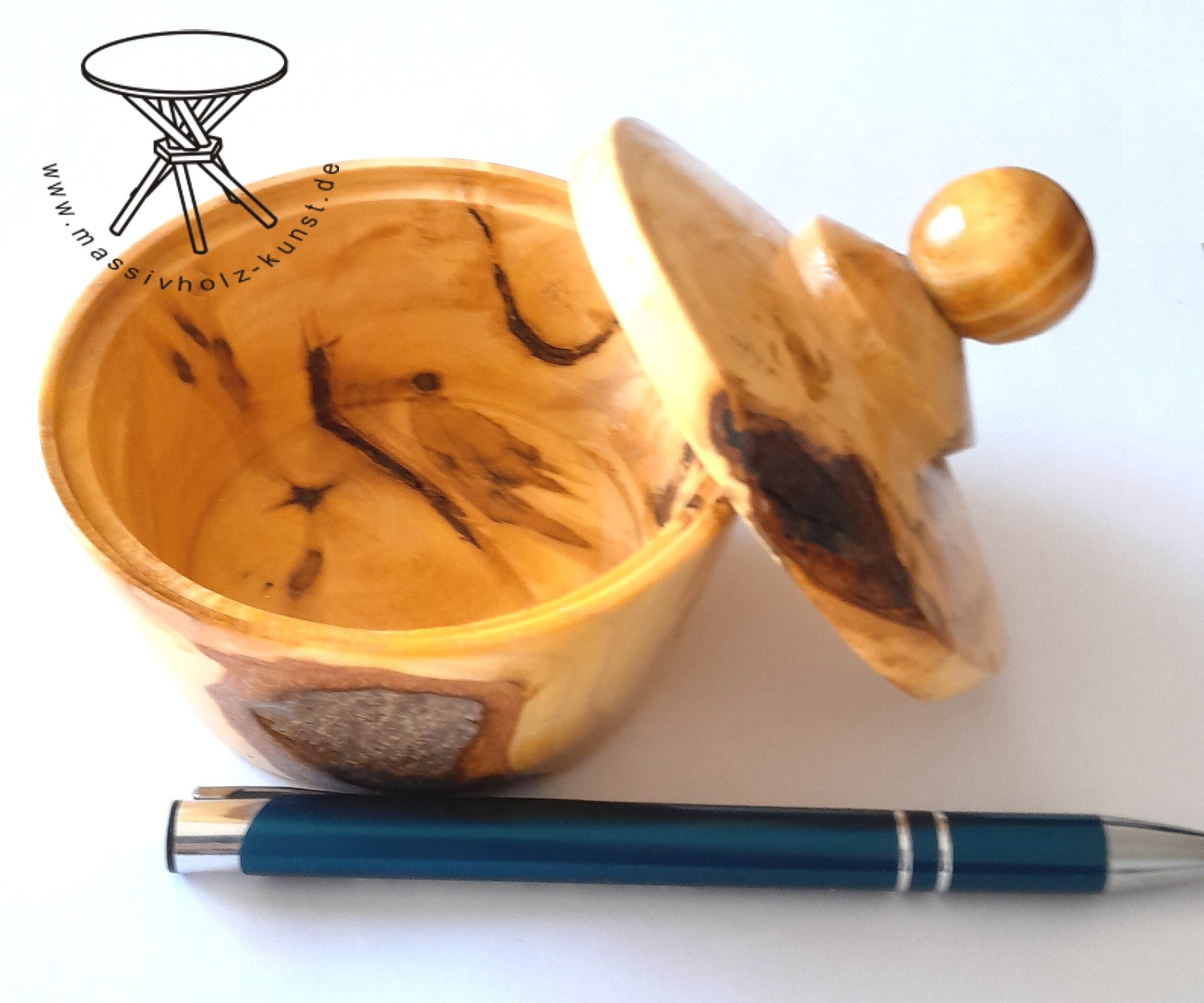 Diese eignet sich zur Aufbewahrung vieler kleiner Gegenstände, als Schmuckkästchen, als kleines Salzfässchen oder als dekoratives Element auf Ihrem Regal. Die Oberfläche wurde nach dem Drechseln fein geschliffen, mit Hartöl geölt und dann mit Carnaubawachs glänzend poliert.