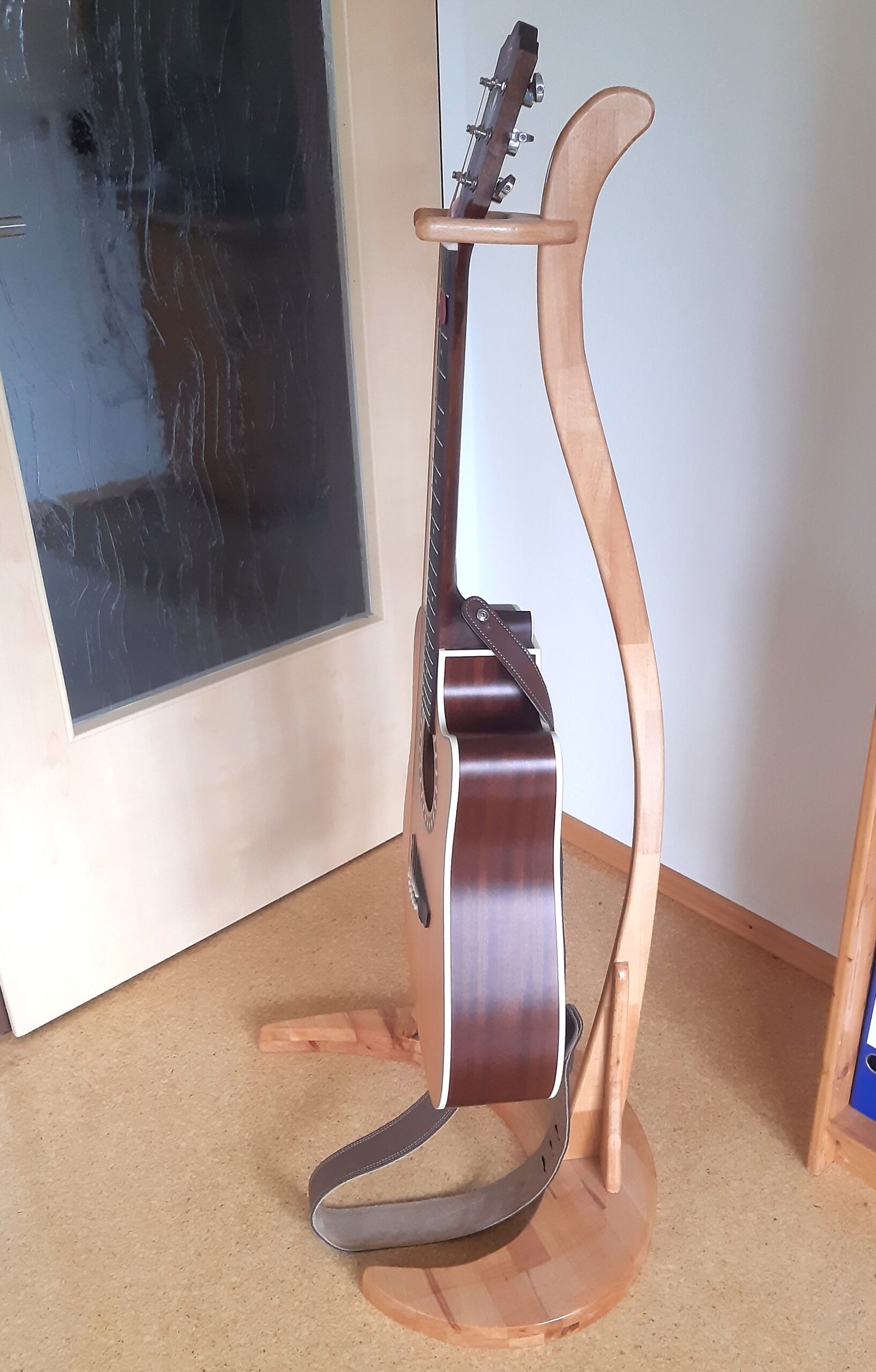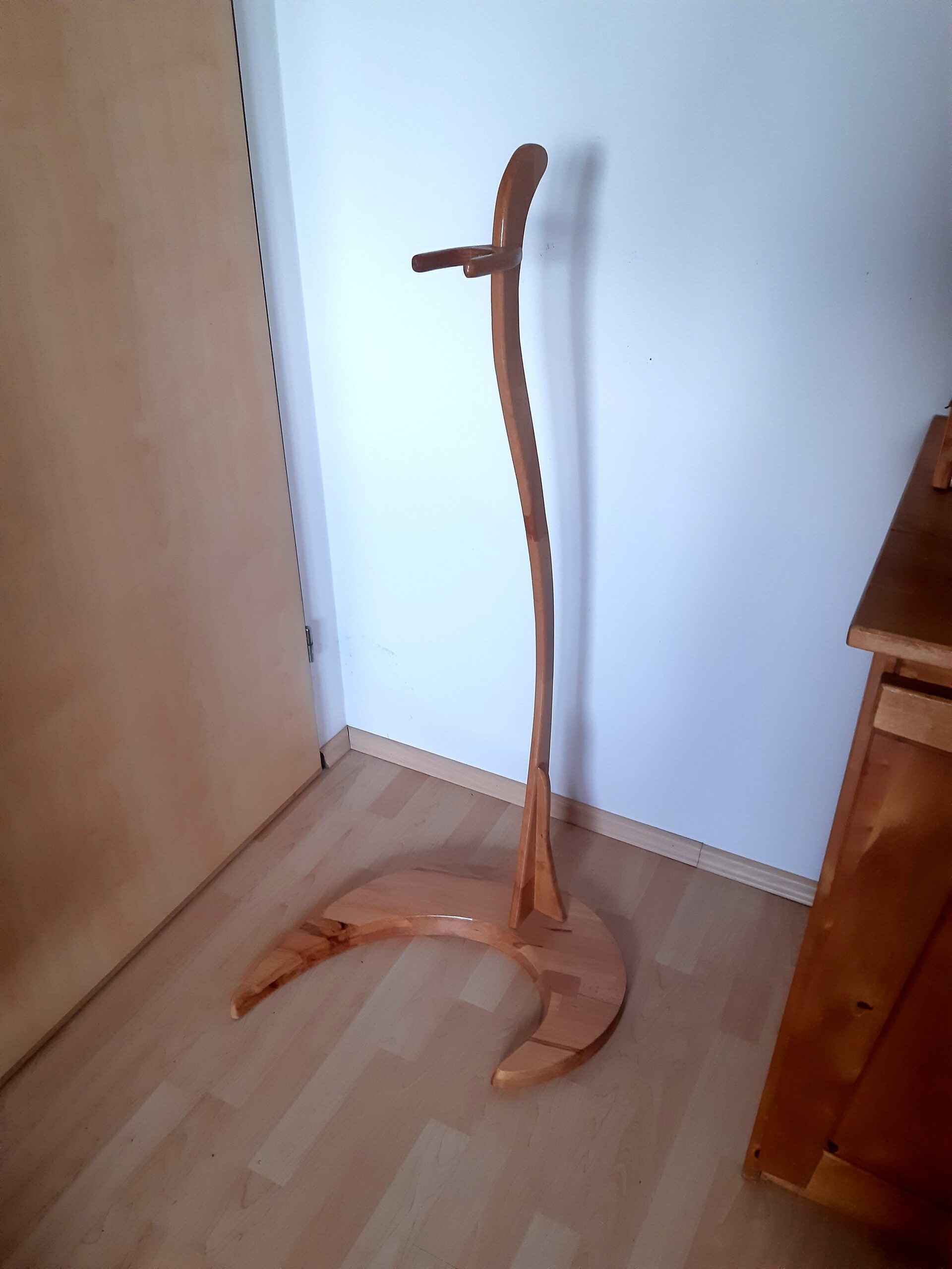 Dieser exklusive, kunstvoll geschwungene Gitarrenständer ist nicht nur sehr praktisch, sondern auch ein stilvoller Einrichtungsgegenstand, der Ihr Musikzimmer ergänzt und aufwertet. Er paßt für nahezu alle Gitarren. Ihr Instrument ist hier nicht nur sicher hängend untergebracht, sondern kommt auch noch stilvoll zur Geltung. Der Gitarrenständer wird aus erlesenen Harthölzern gefertigt. Es handelt sich um ein Unikat.